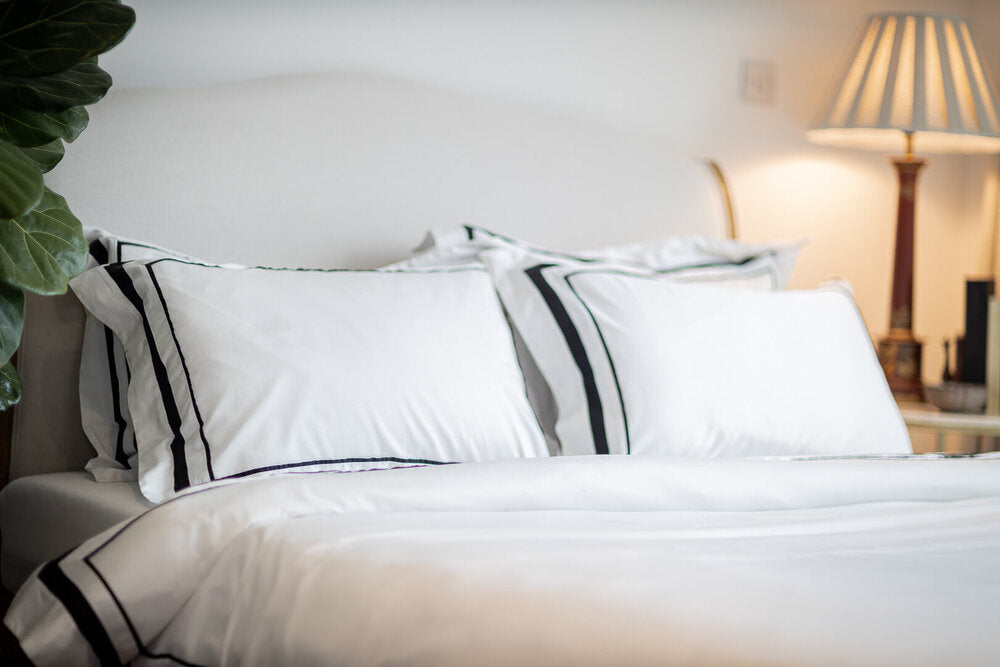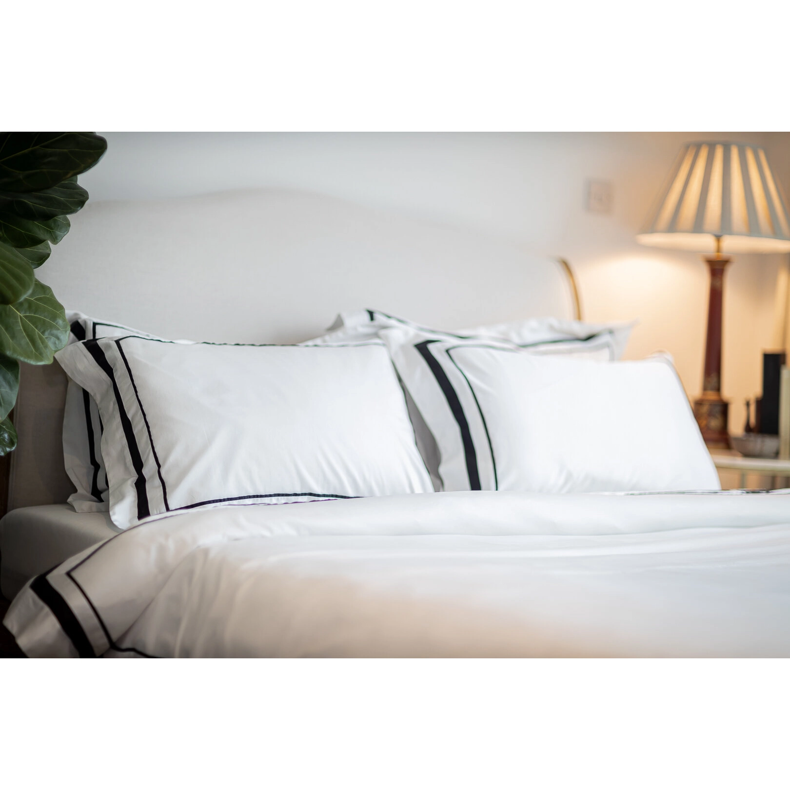 This smooth, 400 thread count, cotton sateen luxury bedding is woven with comfort, softness and durability in mind. The sateen technique of weaving gives the fabric a buttery soft feel and a very slight glow. This pure white bedding set has a double black coloured border all around the duvet and oxford pillow cases.