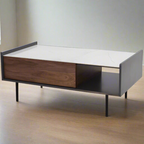The Reuben coffee table is design-led with a unique matte grey casing and lightweight open storage. Topped with wonderfully smooth natural ceramic, this walnut coffee table combines classic luxury with modern detailing.