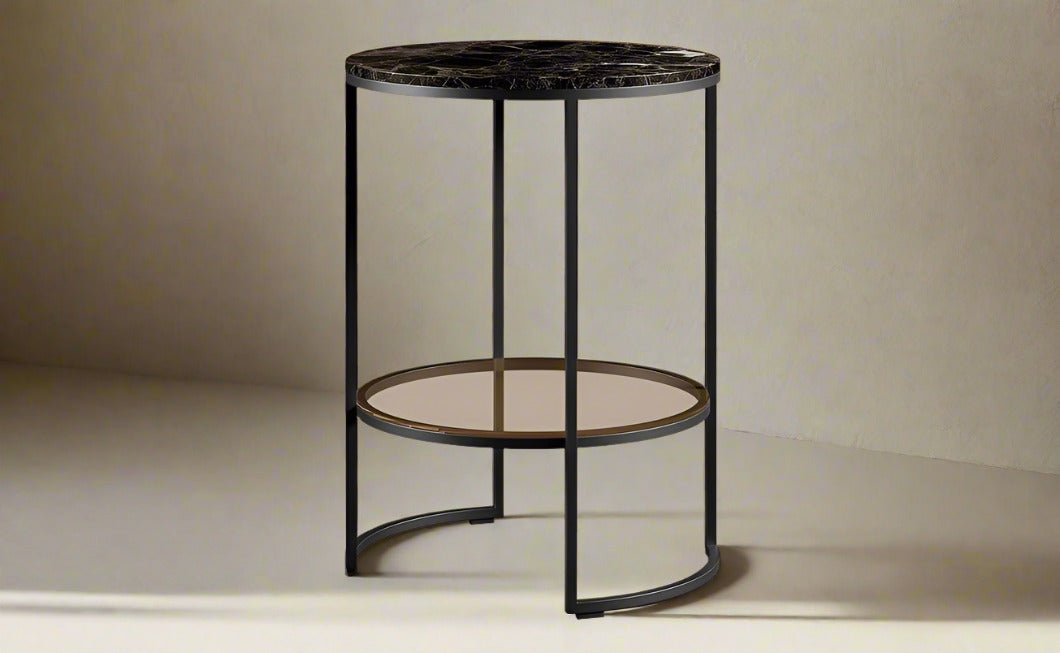 Simple and classic elegance inspired the design of the Terran side table. But it's not the traditional manifestation of simplicity, it boasts a unique black marble top and a tempered glass shelf offering a vintage-esque finish.