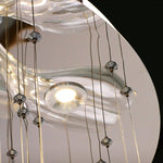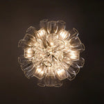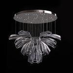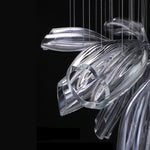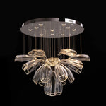 The Peonia Chandelier is a contemporary marvel, boasting a design that evokes the organic shapes of flower petals or cascading waterfalls. It features an array of curved, transparent crystal elements that descend from a central golden hub, creating a dynamic, blooming effect. The light sources nestled within the fixture cast a warm glow, which is magnified by the glass, resulting in a radiant illumination that enhances the ambience of any room.