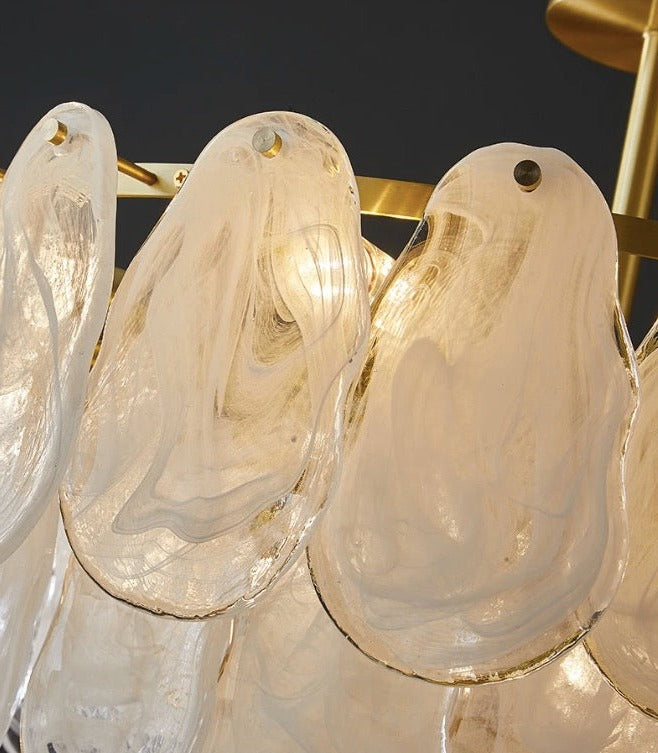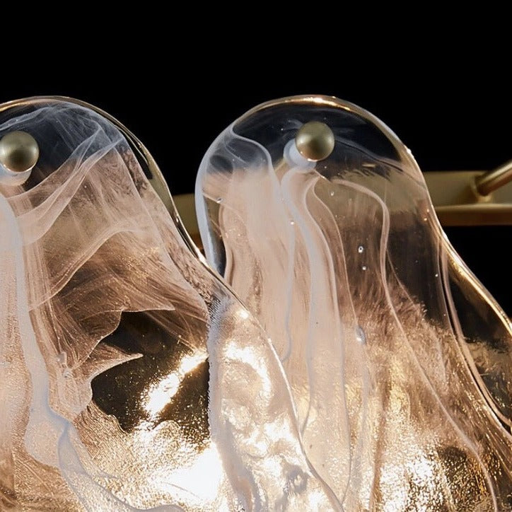 Made-to-order, frosted glass feathers emulate the softness of swan-down