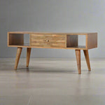 Experience sophistication with the Melina Coffee Table, crafted from the finest 100% solid mango wood. Its versatile and contemporary design is perfect for modern interiors. A clear lacquer finish adds durability, ensuring years of use. The drawer front features a unique mixed wood pattern and candle knobs for effortless access, making this piece a true work of art for your home.