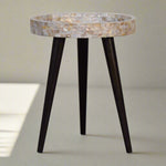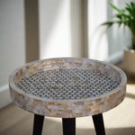 Expertly crafted from 100% pure mango wood, the exquisite Shell Mosaic Side Table showcases ash black Scandinavian-style legs and boasts a mosaic circumference, featuring a base with a stunningly intricate honeycomb shell design.