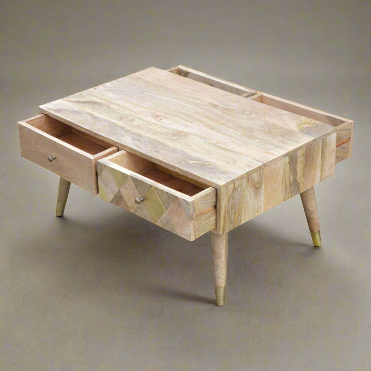 The intricately designed and handmade Colette Oak Brass Coffee Table boasts four drawers with a stunning brass insert on the front, four Nordic-style legs with gold-plated feet, and a spacious tabletop for styling with magazines, candles, or décor.
