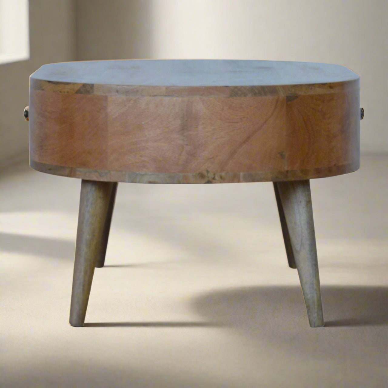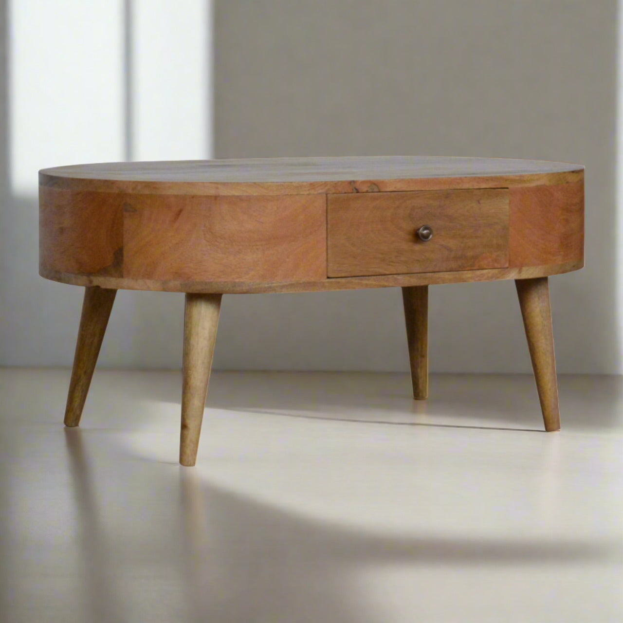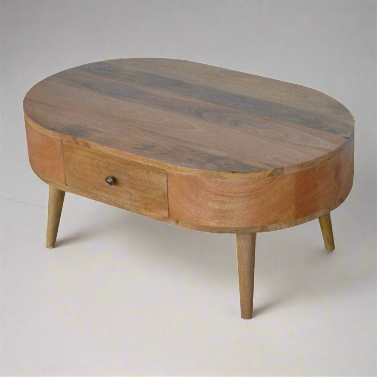 Crafted entirely from 100% solid mango wood, this elegant coffee table adds a touch of simplicity and sophistication to any bedroom. It boasts two drawers, smooth rounded edges, luxurious shiny knobs, Nordic-inspired legs, and a sleek oak finish.