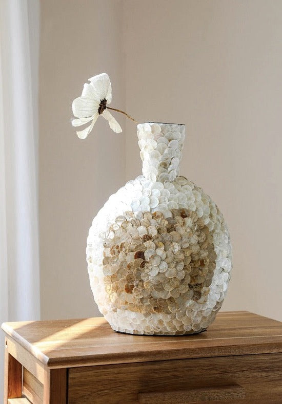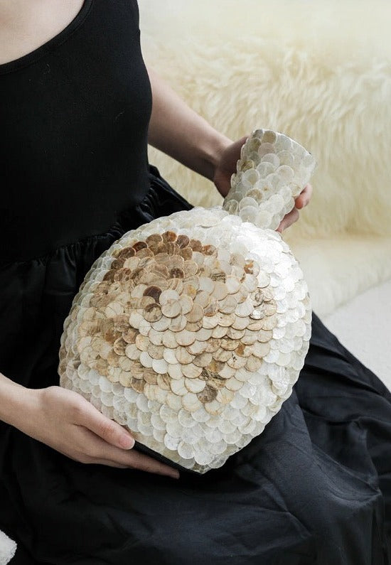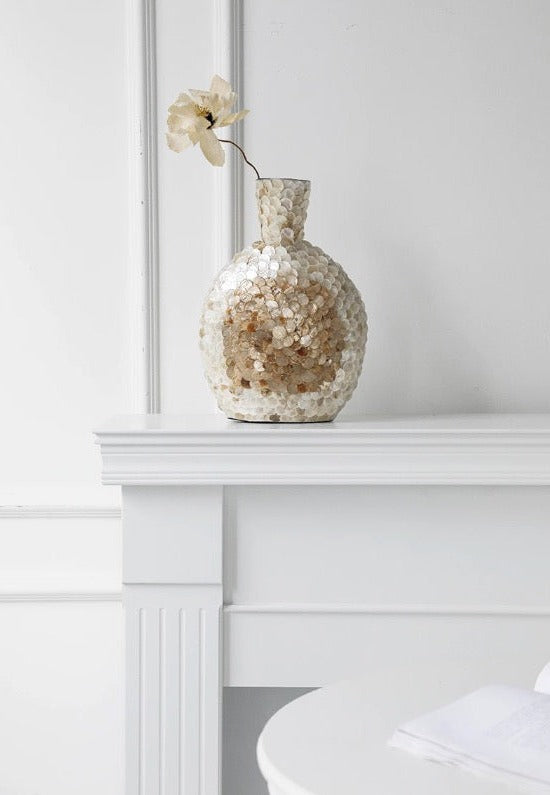 Standing gracefully, the Nacre Shell Vase brings a whisper of coastal charm to any setting. The delicate arrangement of shells in varying shades from white to sandy beige evokes the timeless allure of nacre, also known as mother-of-pearl. Perfect if you appreciate the delicate balance of natural art and elegant design, the Nacre Shell Vase is a profound expression of love for the world beneath the waves.