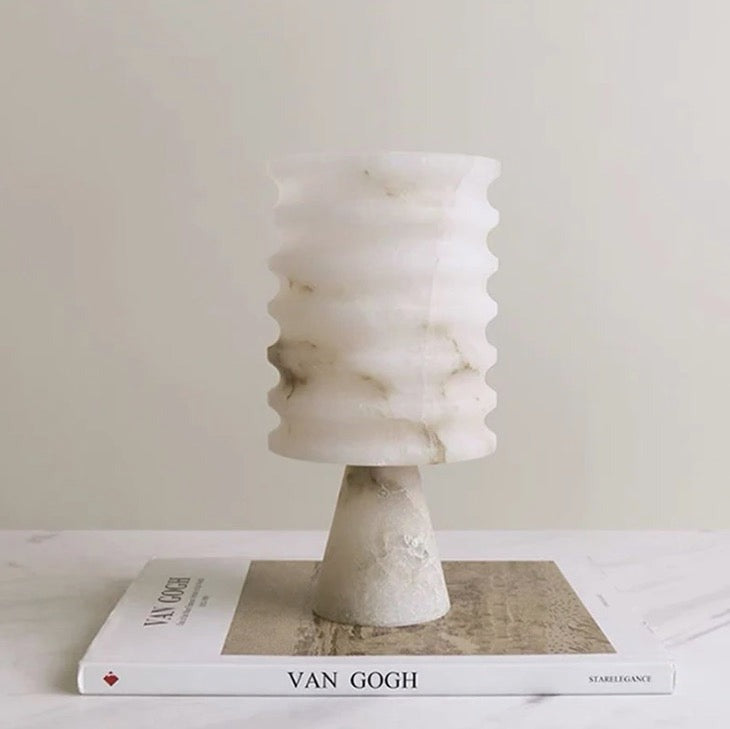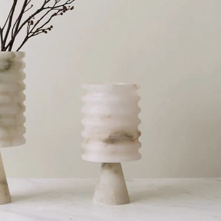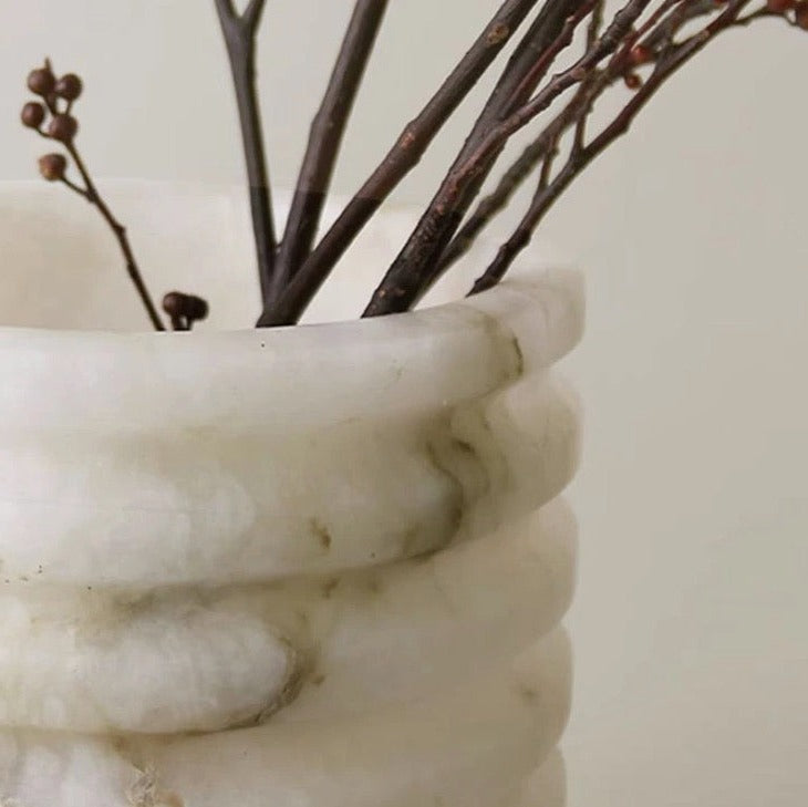 Whether used as a centrepiece or a decorative accent, the Esther Vase brings a touch of sophistication and luxury to any setting. The ribbed cylindrical body not only captures the light but also beautifully showcases the distinctive veining and creamy hues of the White Onyx, making each vase a unique piece of art. It is an ideal gift for those who appreciate the beauty of natural stone and the art of fine craftsmanship.