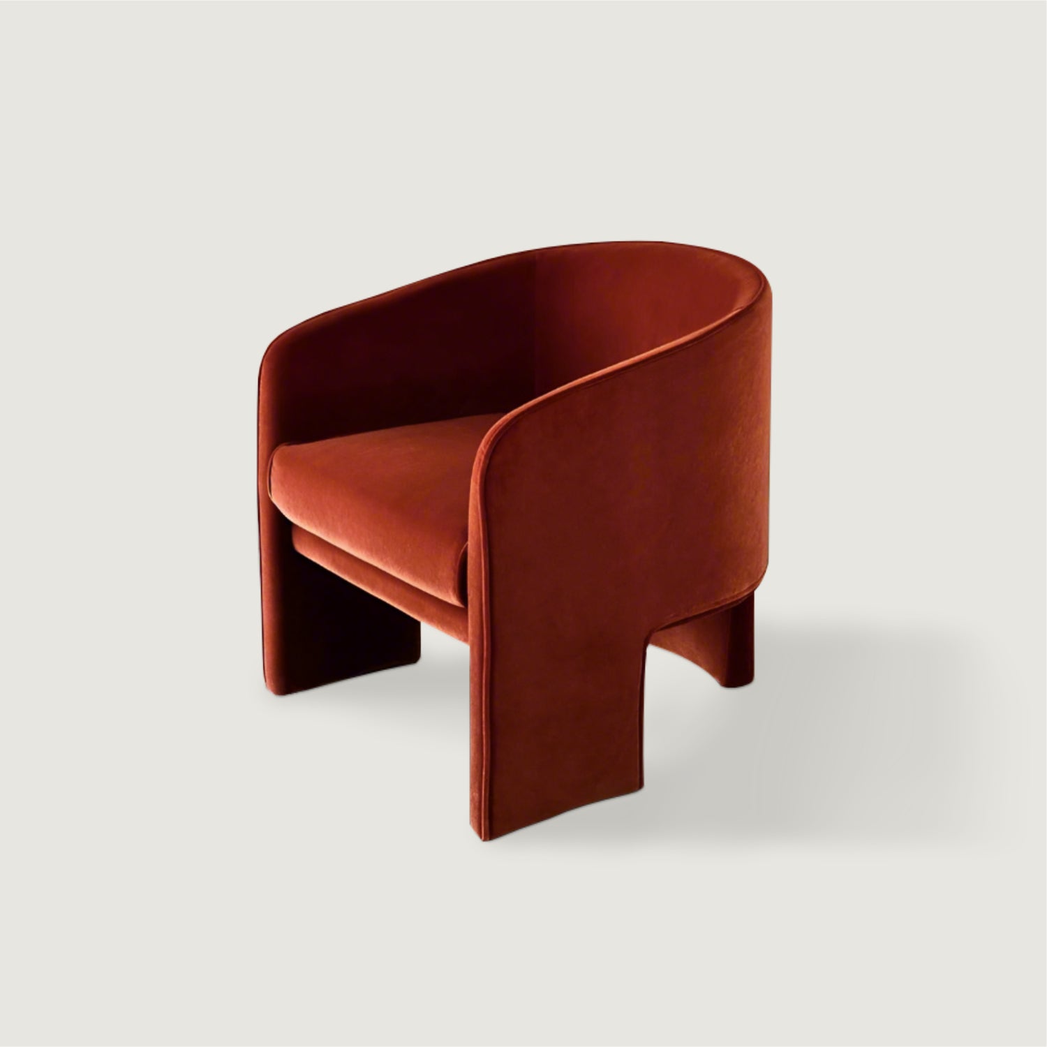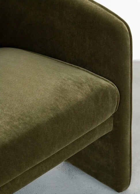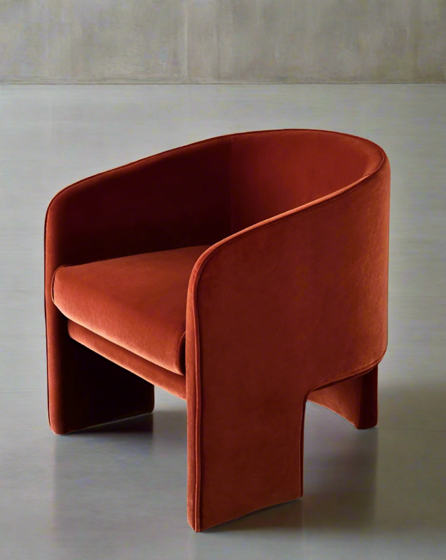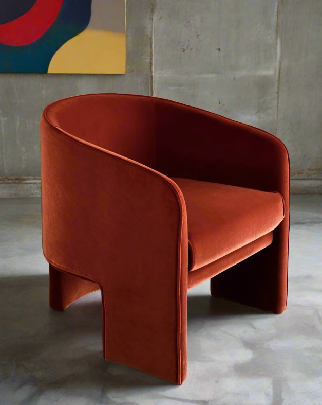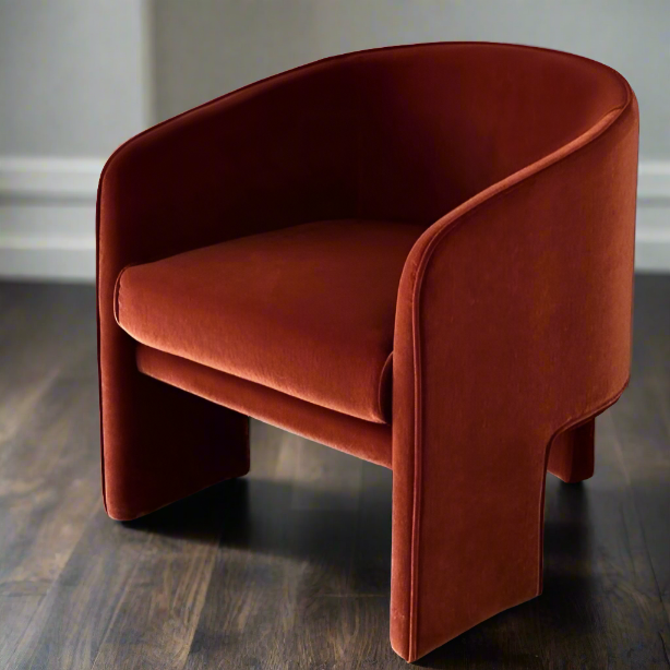 The Giles Chair exudes a bold charm and contemporary grace, dressed in the luxurious embrace of velvet. This chair's design features clean, flowing lines that form a rounded, enveloping back and deep seat, ensuring comfort that's as inviting as its aesthetic. The rich texture of the velvet adds a tactile indulgence to its sweeping curves, perfect for sinking into after a long day.