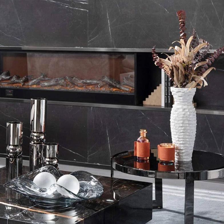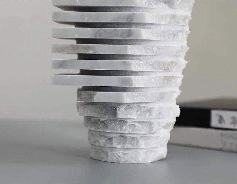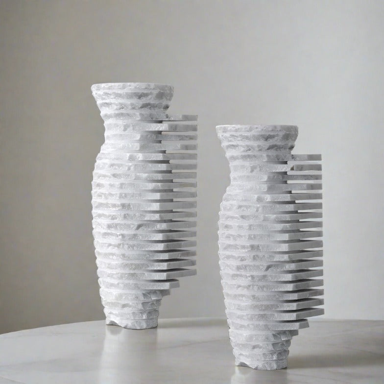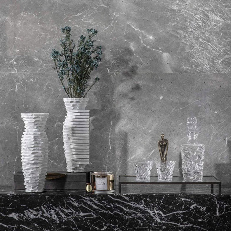 Standing tall, the Selina Vase is both a functional piece and a statement of art. The series of carefully chiselled horizontal bands wrap around its form, creating a rhythmic pattern of light and shadow. This intricate layering accentuates the natural veins of the marble and gives the vase a dynamic texture that is visually captivating. Whether placed in a contemporary living room, a sleek office, or a cosy nook, this vase enhances the ambience with its serene presence and architectural appeal.
